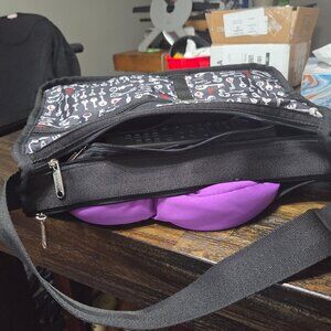 two main zip compartments, an expandable front section for extra space, and multiple exterior pockets for easy access. It comes with an adjustable shoulder strap. made with recycled materials for organized, versatile everyday use.