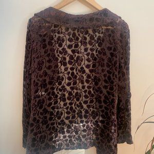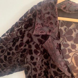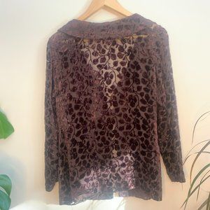 This dark brown cover-up is a mix of elements of velvety and sheer leaf patterns. The one-button closure for an open or closed style. Throw this over a work out fit or add it as an elegant touch over a dress.