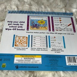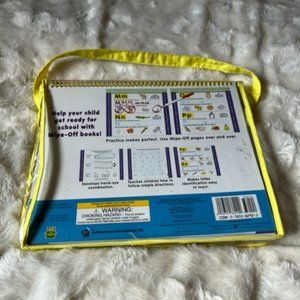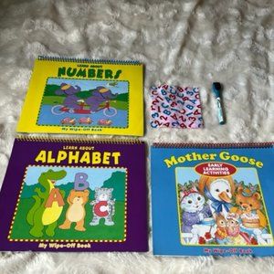 Leap Frog My Wipe Off Books with Snap Closure Carry Case. Vintage books from 2002. Includes 3 books, 1 Dry Erase Marker, 1 cloth. Books with activities - Learn About Alphabet, Learn About Numbers and Mother Goose. Pages are plastic coated and can be wiped with cloth or with brush tip of marker. Adult supervision required. Not recommended for children under 4. Carry case has some marker stains. Each book has 17 pages of activities and new learning. Colour depends on device/screen settings and lighting in pictures. All items are from my smoke free home.