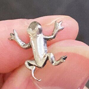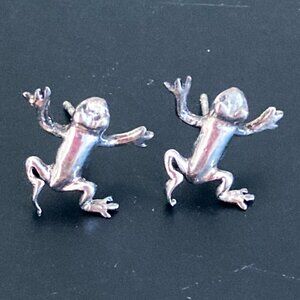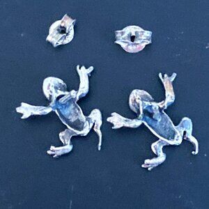 These adorable creatures, caught in mid jump, measure just over a half inch long. They are stamped 925 on both the backs and the backside of the bodies, but not clear enough to photograph. In very good shape, with some tarnish on the backsides.
