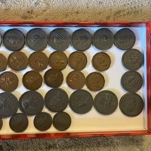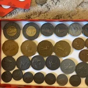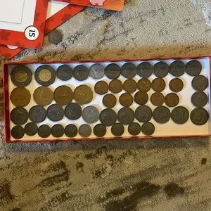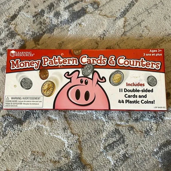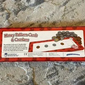 11 double sided cards and 44 plastic coins. To help teach your child basic math skills (counting, sorting, grouping)
