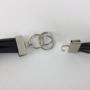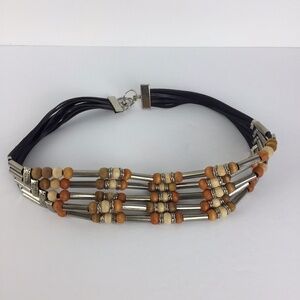 Western Boho design. Five-straps. Metal and wood beading. Measures 28.5 to 30 inches. Hook closure.