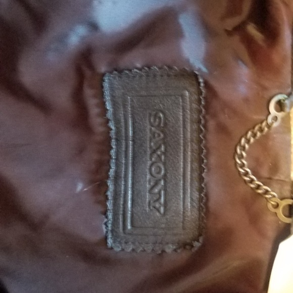 Vintage black leather jacket. Great bomber style coat jacket. Features double zip up for extra warmth. Two outside zippered pockets and 2 regular pockets at side. Inside has an open pocket near chest. Elasticized waist. Has a chain loop to hang up. Size small. Measures 20 in. armpit to armpit. 25 in. length. Sleeve 24 in. length Polyester cloth lining. Condition: Good. Brand is SAXONY. 1990's.