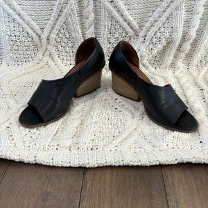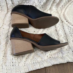Great pair of black leather shoes. Open toe, great for work, flattering open inside, excellent comfort. Great condition. Heel 2.5 inches.