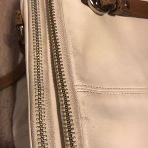 Leather Coach purse with 3 compartments, two zipper and one snap closure. In good condition. Some scuff on leather by zipper and on bottom corner. Minor stain on bottom interior.