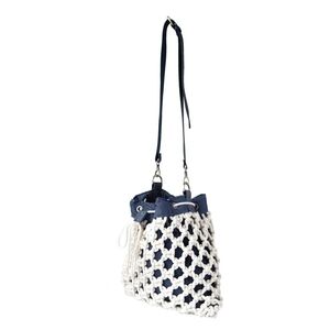 This adorable bag is a true testament to artistry, made with knitted cotton macrame yarn and featuring a fancy jean lining with a generously sized pocket. The adjustable navy blue genuine leather handle allows you to wear it as a crossbody or arm bag, making it a versatile addition to your wardrobe. This cool bag is perfect for casual outings and beach adventures, effortlessly combining fashion and function.