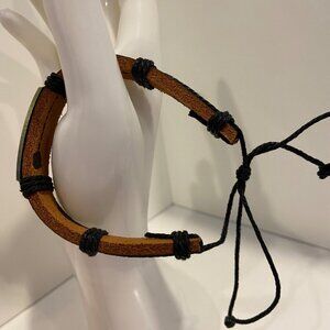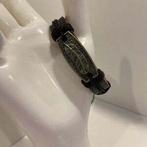 This bracelet features a feather design on a leather band, providing a casual yet stylish accessory. The adjustable closure ensures a comfortable fit.