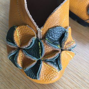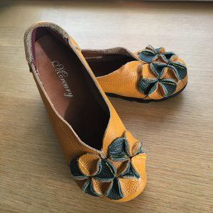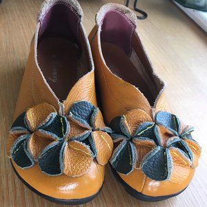 Padded insole & super comfy rubber sole, beautifully crafted leather, Mercury Brand, trendy retro style with yellow & green combo, no size quoted but fit's like a wide 5 1/5 - 6