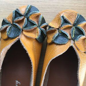 Leather Flats With Flower Detail Yellow Gold & Forest Green