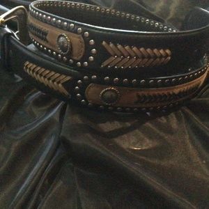 Genuine leather, can be for me or women. Western style. 1 1;2 inches wide. On a Black leather base. Never worn. The belt buckle has light Florentine design. The belt buckle snaps on with 3 snaps can easily place any other buckle to adorn belt.