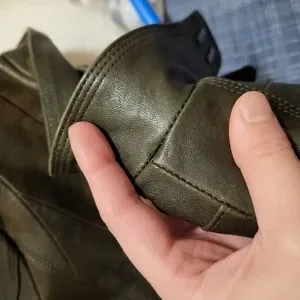 It came with severe discoloration on the back of one of the arms which I have mostly fixed with leather conditioner, but there is a small spot still on the back, which is more noticeable in the picture than in real life. I also noticed a tiny ripped seam underneath the collar.