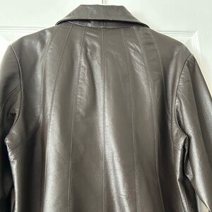 Excellent condition leather jacket. Brown with multi brown lining. . 25" shoulder to hem, 24" sleeve, 22.5 " across the chest