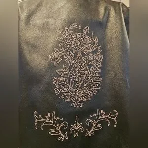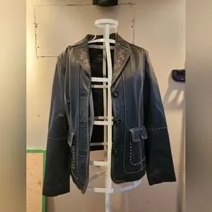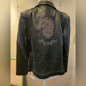 Elegant black leather jacket with intricate embroidery. Perfect for adding a touch of sophistication to any outfit.