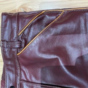 Zippered back pocket. Zipper fly and snap button closure. Burgundy.