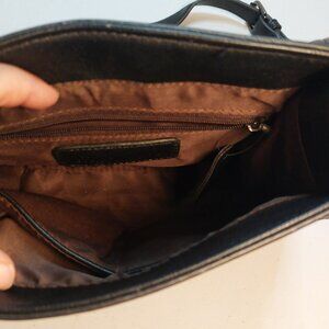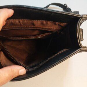 Crafted for the stylish and practical woman, the Mellow World Leather Rainbow Crossbody Purse combines functionality with a splash of color. The exterior boasts a sleek black finish, complemented by a coordinating black strap, providing a versatile look that transitions effortlessly from day to night.The purse features a compact design, measuring 10 inches in width, 8 inches in height, and 7 inches in depth, ideal for carrying your essentials without the bulk. Inside, you'll find a warm brown lining, ensuring your belongings are nestled in comfort. With its modest size and timeless style, this crossbody is an excellent accessory for any outfit. N/S pet friendly home. Please visit my closet for similar items. Thx for looking.