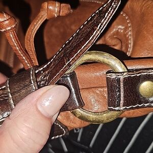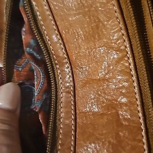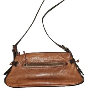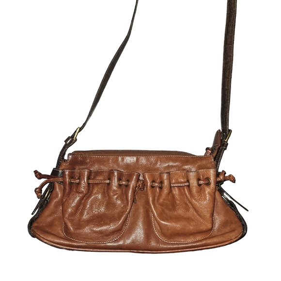 With 2 structured pockets in front with magnetic snaps, back zippered pocket, dark brown strap and tan body.
