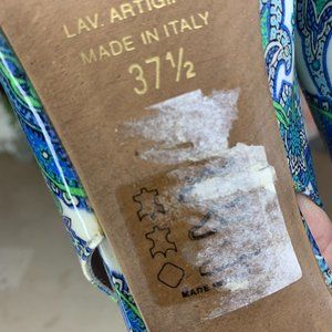 Beautiful patent leather Italian slingbacks in a blue/green/cream paisley pattern. With a 2.5" heel, these are very easy to wear. Very gently used and in excellent condition.
