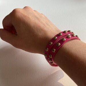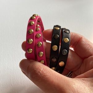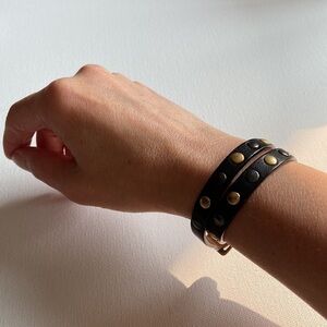 Pair of leather studded wrap bracelets. Buckle closure on both.