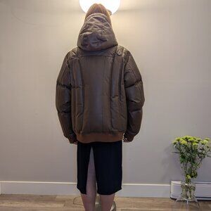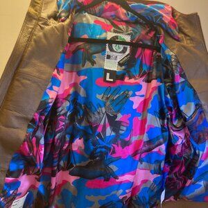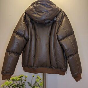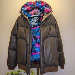 Warm and stylish brown leather jacket with brightly colored lining, new item condition.