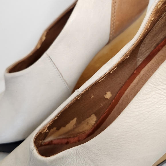 Vintage late 90s Y2K, Italian Leather Uppers, Rubber Soles, Wooden Wedge, Bronze YKK zipper heels, burnt orange leather insoles & comfy gradual incline, Barely Worn (they were a half size too big for me but I couldn't bare to sell them and now the lining inside has started to peel (maybe a fabric paint would fix it?), outsides look Excellent, Size 38, 7-1/2.