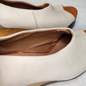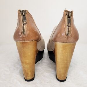 Vintage late 90s Y2K, Italian Leather Uppers, Rubber Soles, Wooden Wedge, Bronze YKK zipper heels, burnt orange leather insoles & comfy gradual incline, Barely Worn (they were a half size too big for me but I couldn't bare to sell them and now the lining inside has started to peel (maybe a fabric paint would fix it?), outsides look Excellent, Size 38, 7-1/2.