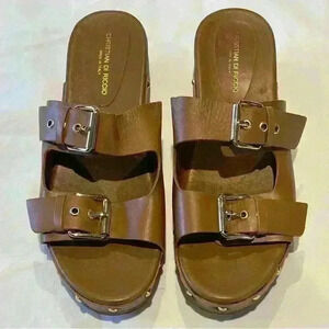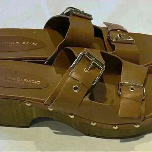 Super cute, wooden clog style, with metal studs. Unfortunately too narrow for me. Worn once, ready for a new home!