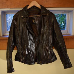 Leather Xelement Women's Motorcycle Jacket. Distressed brown leather look. Feminine fit with a tailored waist, cross body zipper, braided cord detailing. Removable lining zips out. Has inner pockets to insert protective padding (not included). Additional inner hidden pocket for cards, etc. Heavy duty, tough leather, meant to project you while you ride your Hog, lady.