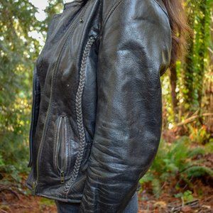 Similar to this: https://leatherup.ca/products/xelement-b8000-classic-womens-black-leather-braided-jacket?variant=13708928647211