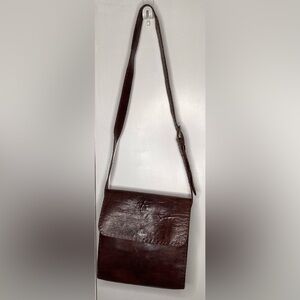 Sturdy leather bag with adjustable strap and zippered compartment. I purchased at Maiwa, although there is no label-in the bag. Works well as a crossbody or a shoulder bag. In great shape