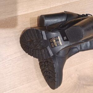 Leather booties like new. Black. Heeled. Zippered for ease of usage. Beautiful, chic, comfortable, sexy. Leather outer, leather cloth inner, rubber soles with tread. Lace up detail on the back. Catherine Malandrino.