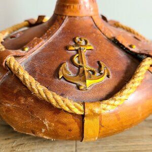 11'' tall, 9'' wide. Has some opening in glass part (covered with leather). Can't hold liquid. For decorative use only.