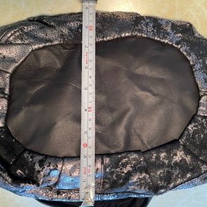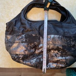 Soft bronze/silver on dark brown leather. Lined with one zip pocket. Hobo style but on smaller scale. Never used. Non smoking house but do have a cat and dog.
