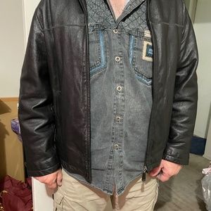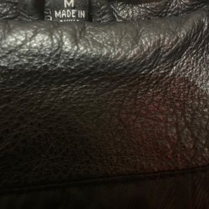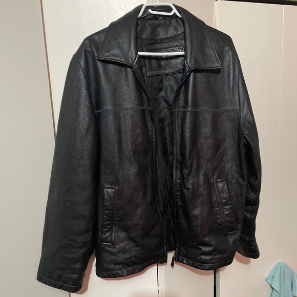 Mens medium real leather jacket great for dress or casual good arm length jacket is a little small for the model but very comfortable .