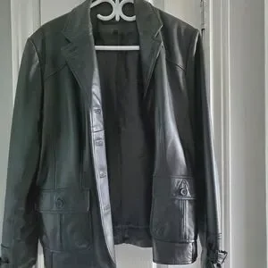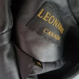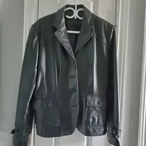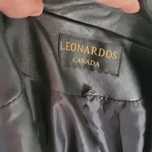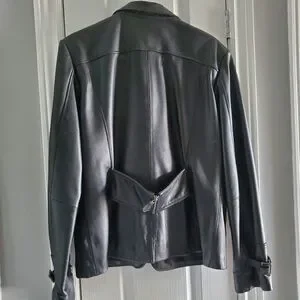 Leonardo black leather jacket. Size 14( but fits smaller). Zipper belt in the back. Buckles on the sleeves. Never worn. Smoke free home.