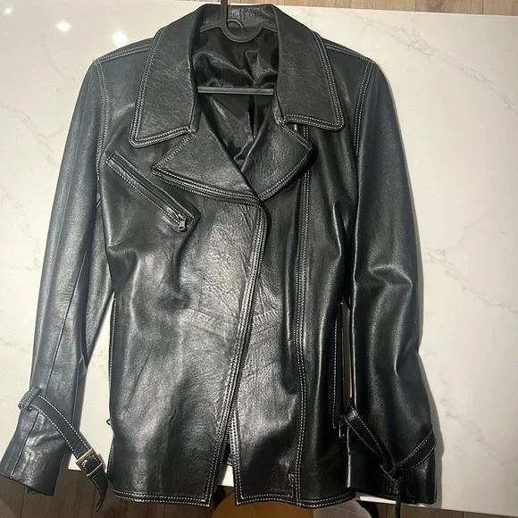 Boack leather jacket with contrasting stitching