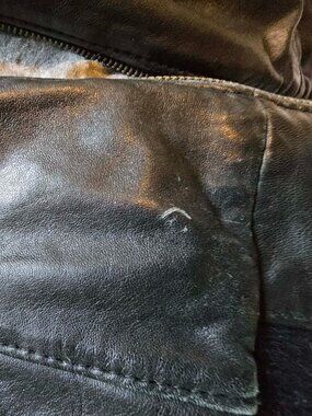 Leather jacket in good used condition has a cut in the front near the pocket as shown in pictures.