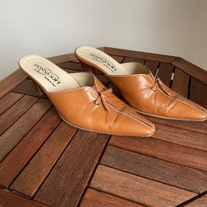 Made in Italy. Classic mules in a neutral colour. Genuine leather. Wooden heel is 2 1/2 inches high. They go with everything!