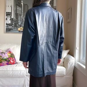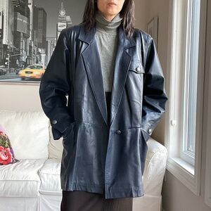 Soft leather. Fully lined with striped material. Chest pockets with button flap. Hand pockets. Lapel. Single button front closure. Missing inner button to fasten. Button closure at cuffs. Shoulder pads. Front button may have been moved to make larger by previous owner(see measurements). May fit size S/M. Model is size small, 5’9. Approx 33in length, 18in shoulder seam to seam, 24in sleeve length, 23in pit to pit, 21.5in width at waist area when side seams are lined up, (23in with current placement of button)21in width at hip area with side seams lined up(23in with current placement of button).