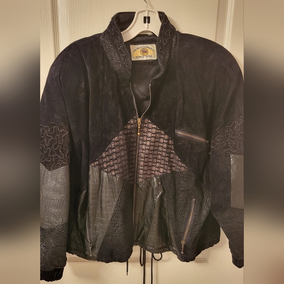 Leather patchwork jacket, zipper up and drawstring detail, long sleeved. It has a neat patch work detail with different textures and beadwork. It's in great condition, no wear on the leather.