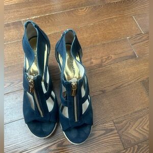 Brand new leather heels, elegant and formal, gray suede with dark gray shiny tip and a silver band. Never worn. True to size, 8.5. Heel 6cm