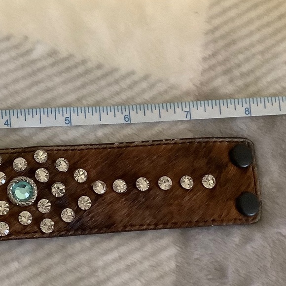 Gorgeous vintage leather cuff with sparkling rhinestones and one bluish turquoise center stone