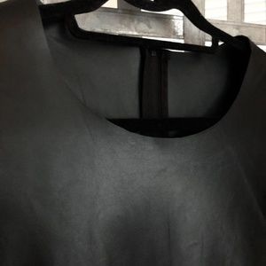 Stunning leather shift dress by Vancouver designer Jacqueline Conoir. Worn twice but a little roomy for me now. Really beautiful on and great piece to layer in winter with fitted high neck, tights and boots. Stylish piping and raw edge around neckline and sleeve edging. Hemline falls roughly above knee/mid-thigh.