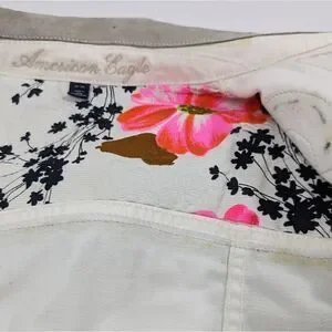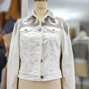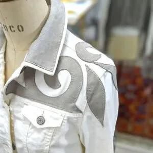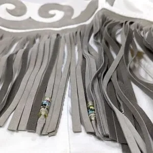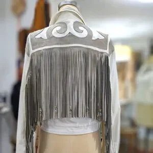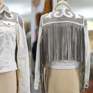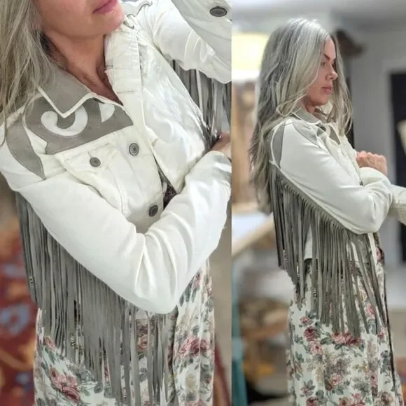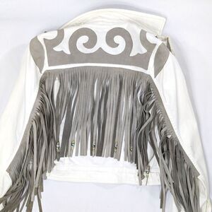 Off white American eagle denim jacket embellished with a moroccan style light grey nubuck leather through front & back yoke. 12" leather fringe has moroccan hand painted bead scattered within.