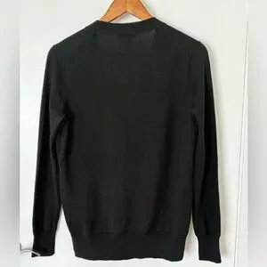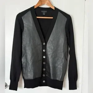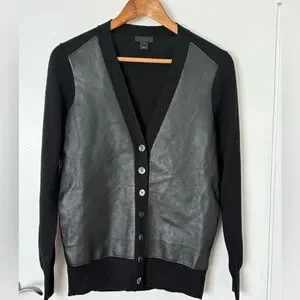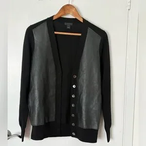 Seen on Reese Witherspoon, black merino wool button-up cardigan with genuine leather front. Perfect for layering. Excellent condition
