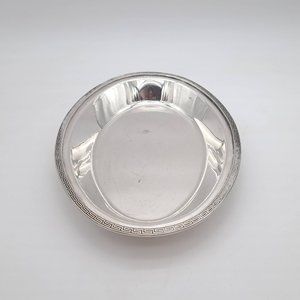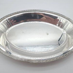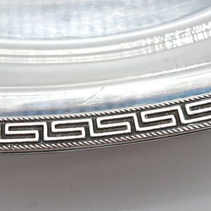 This is a silver plated tray made in Lebanon by Siom Orfevres, a silversmith company that started in 1967. My best guess is that it was made in the 1970s as at that time in Montreal we had a large influx of Lebanese due to the issues in Lebanon. The tray's rim is made up of a ring of interlocking meanders. There are scuffs and the base metal is brass.