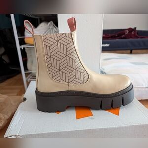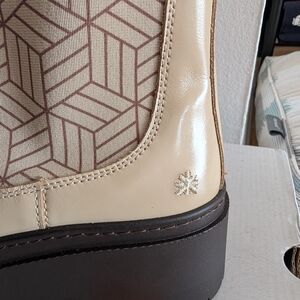 Elegant beige ankle boots with unique pattern. Durable sole for comfort and style.