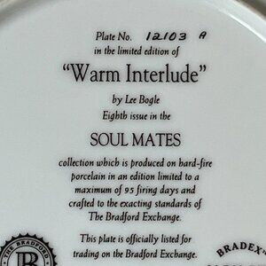🌾 The plate in the image is titled "Warm Interlude" and is part of the "Soul Mates" series by artist Lee Bogle. The plate was produced as a collector's item by the Bradford Exchange in 1995.