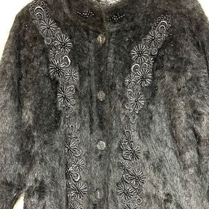 Lee Sands vintage Black Embroidered rabbit angora Hair Blend sweater coat Sz L