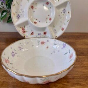 Lefard England Vintage Floral Divided Dish and Matching Serving Bowl – Gold Trim