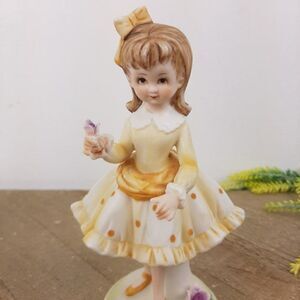 Beautiful Lefton Girl in a polka dot orange dress holding a single purple flower. At every angle of this figurine there is something precious to look at. All hand painted from Japan. This is dated from the label to be anywhere from 1960-1983.